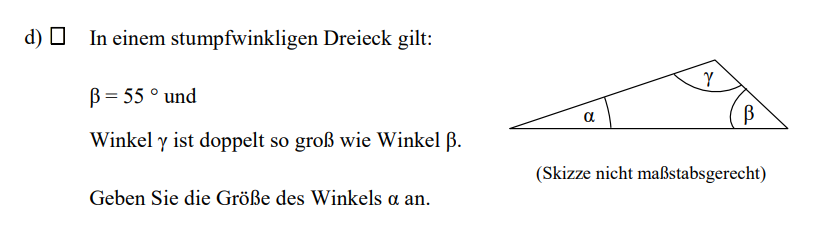 Beta ist gegeben. Damit kannst du dir Gamma ausrechnen. Jetzt hast du zwei Winkel und du kennst du Winkelsumme im Dreieck. Schreibe alles bitte sauber hin, damit beim Korrigieren klar ist, dass du dir das Richtige gedacht hast. Also