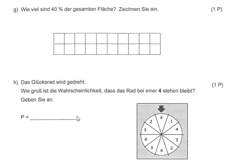 Erkenntnis: in beiden Aufgaben geht es um Anteile. In a) soll ein (relativer) Anteil gezeigt werden, 40% oder 0,4. In diesem Fall leicht: 4 von 10 Kästchen in ein Anteil von 0,4. Es könnten aber auch 20 von 50 Kästchen sein – ebenfalls 0,4! Sprache: mit Anteil meinen wir den relativen Anteil, also 0,4. Jetzt zu b): auch hier geht es um einen Anteil. Es sind 10 Felder – wie groß ist der Anteil mit Feldern, die eine “4” haben? Genau diesem Anteil entspricht die Wahrscheinlichkeit, dass die 4 kommt.